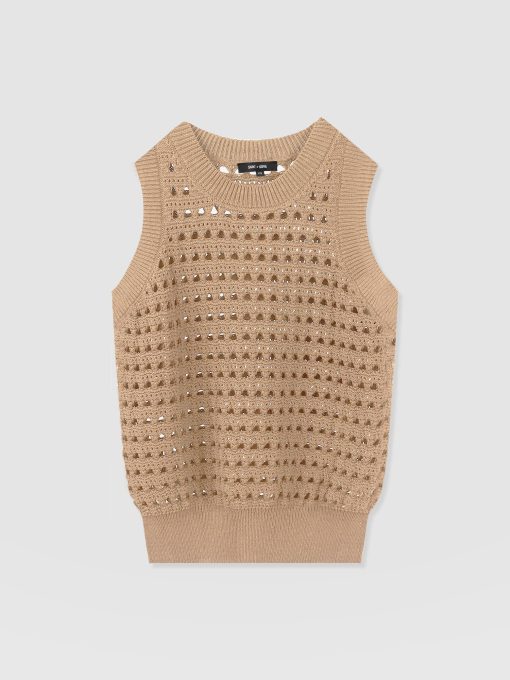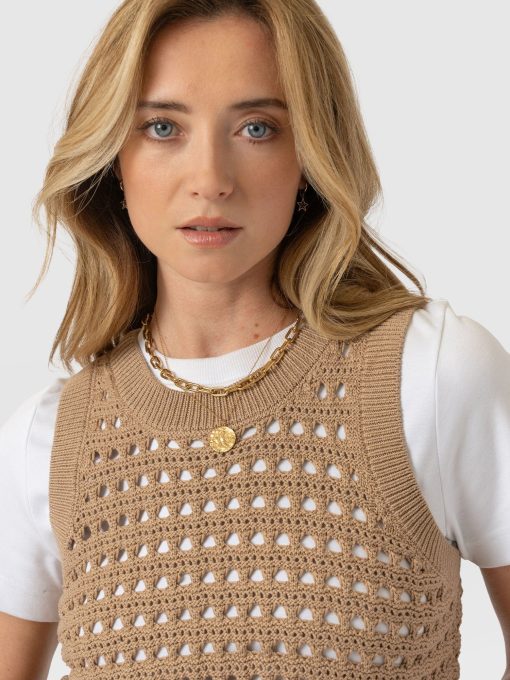 Built for layering, the Adler Sleeveless Knit in camel is perfect for those transitional months. It’s woven to an open-knit that creates a lace hole mesh texture and is cut to a sleeveless silhouette to leave the arms of your undershirt on show. Style yours with a white button-up and a pair of Maeva Skinny jeans, and let the ribbed hem cinch your waist.