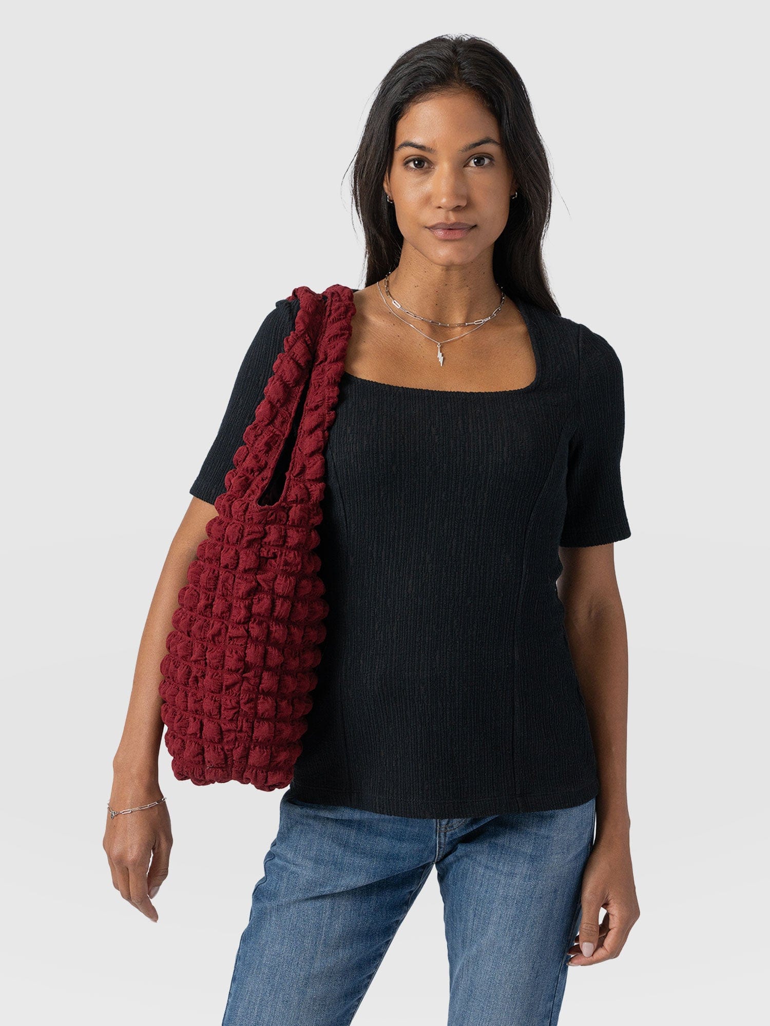 Handmade using stretch-infused organic cotton, the Akia Short Sleeve Tee in black is the perfect elevated basic to add to your wardrobe. It’s stitched to a slim-fitting silhouette with a square neckline and short sleeves. But for added interest, the entire bodice is lightly textured with subtle details. Wear yours with skirts, pants, or your favourite jeans and dress up with heels when you’re heading out under the moonlight.