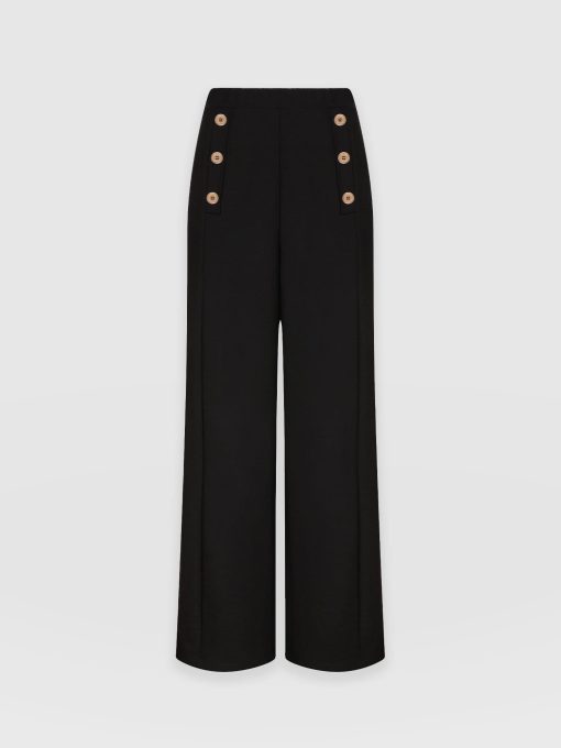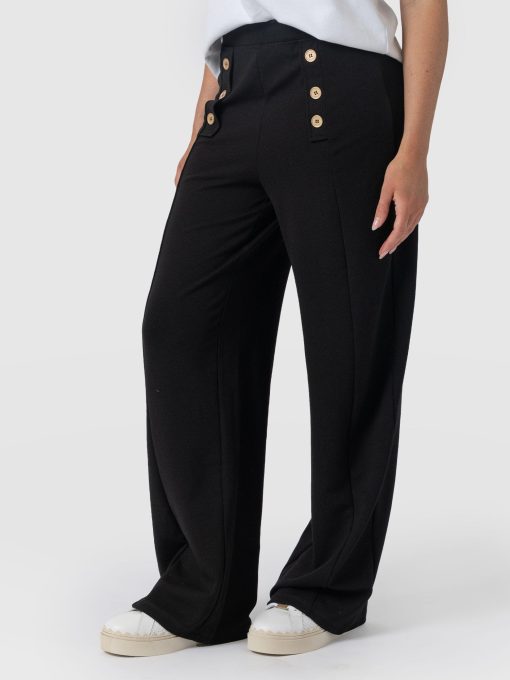 A classic wide leg pant style, made with the softest Ponte di Roma fabric from Italy and gold button detail. High-waisted, comfortable and relaxed with an elasticated waistband finish and pull-on construction. We love the soft Ponte di Roma fabric because its wrinkle and crease free with a beautiful drape. Each style is handmade in our studios with discrete stitching. Perfect for work or weekends, style up with heels or down with sneakers or sandals.