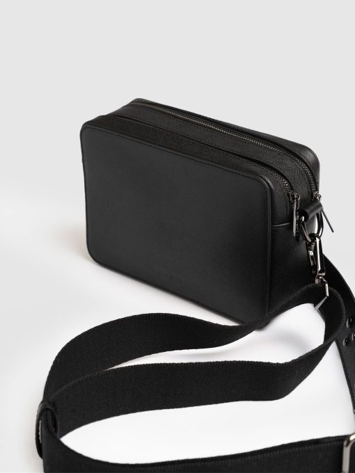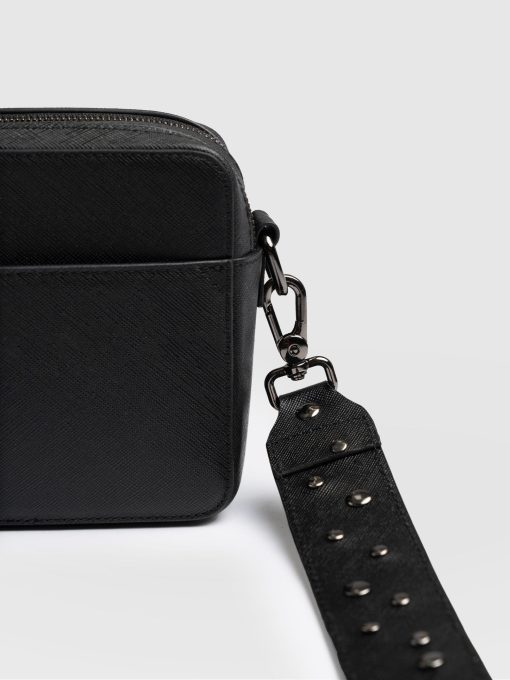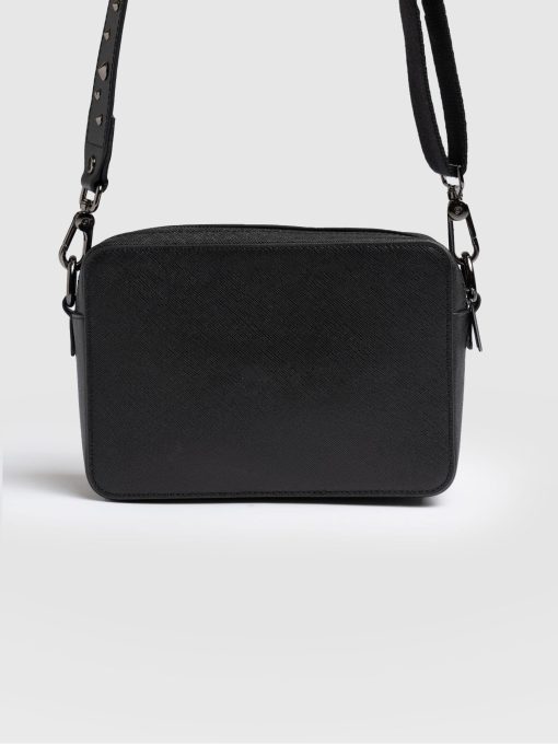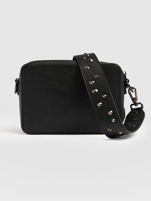 Function meets design with this beautifully crafted cross-body bag in black. Made from pure Saffiano leather, it’s shaped to a classic camera bag shape and adorned with a studded leather strap for a touch of grunge. Inside, you’ll find plenty of space to store all your daily essentials and a zipped pocket to keep your keys and wallet safe. Each bag is designed in our London studios and tailored with gunmetal hardware for a chic finish.