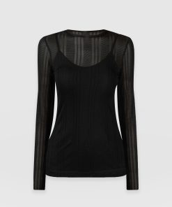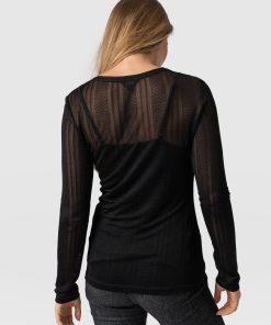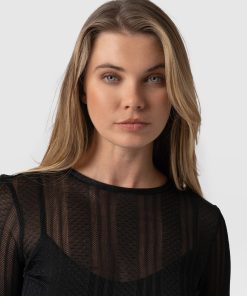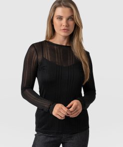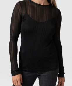 A chic, long-sleeve lace tee in black. Handmade with soft vertical striped stretch lace, this crew neck tee adds a touch of refinement, making it suitable for various occasions. It comes with a separate black cami for effortless layering and coverage. For a desk-to-drinks ensemble that will turn heads, style the Demi Lace Long Sleeve Tee with our Marina Split Skirt in Green Satellite and our Noho Boot.