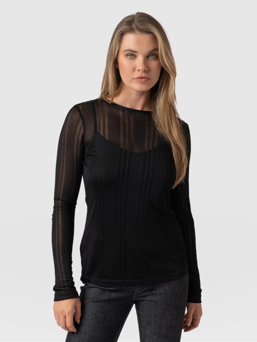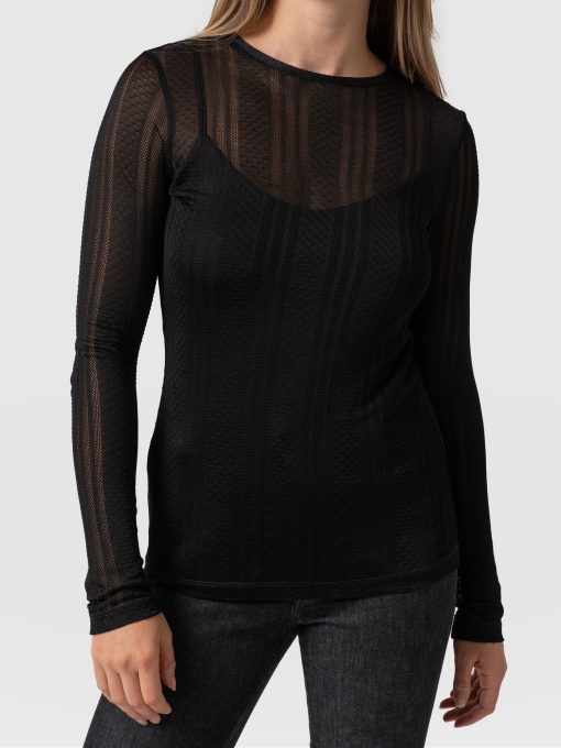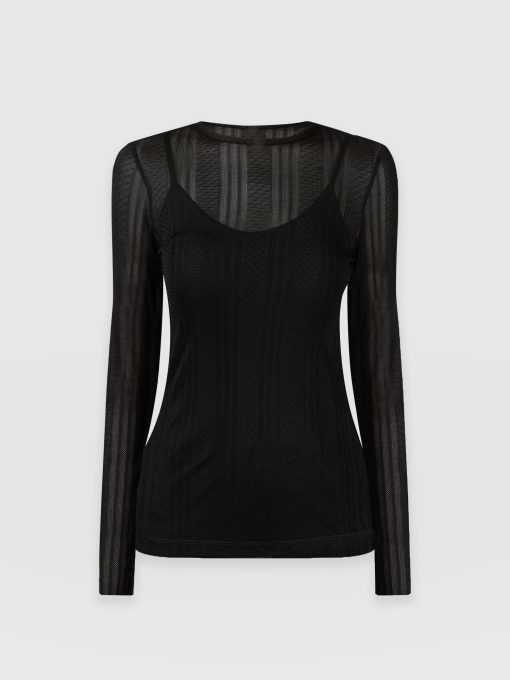 A chic, long-sleeve lace tee in black. Handmade with soft vertical striped stretch lace, this crew neck tee adds a touch of refinement, making it suitable for various occasions. It comes with a separate black cami for effortless layering and coverage. For a desk-to-drinks ensemble that will turn heads, style the Demi Lace Long Sleeve Tee with our Marina Split Skirt in Green Satellite and our Noho Boot.
