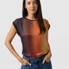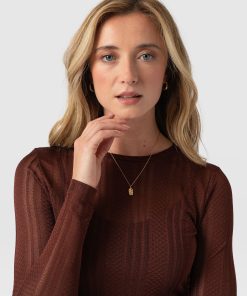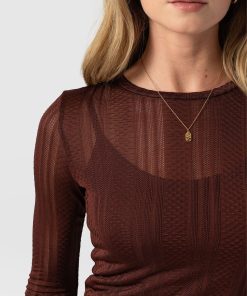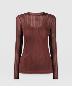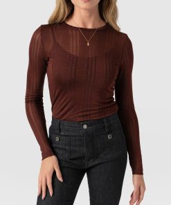 A chic, long-sleeve tee in maroon. Handmade with soft vertical striped stretch lace, this crew neck tee adds a touch of refinement, making it suitable for various occasions. It comes with a separate maroon cami for effortless layering and coverage. For a desk-to-drinks ensemble that will turn heads, style the Demi Lace Long Sleeve Tee with our Wide Leg Jeans and our Noho Boot.