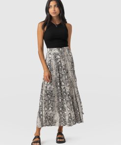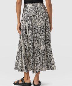 Taking a walk on the wild side, our Eliza skirt boasts a monochrome snake print across its entire A-line silhouette. This serpent-inspired style is designed to sit at your waist with a flat waistband before falling into box pleats, which help to create a breezy finish. Wear yours with a black tee, chunky knitwear for warmth, and a pair of Billie Rock Boots to create a look with edge.
