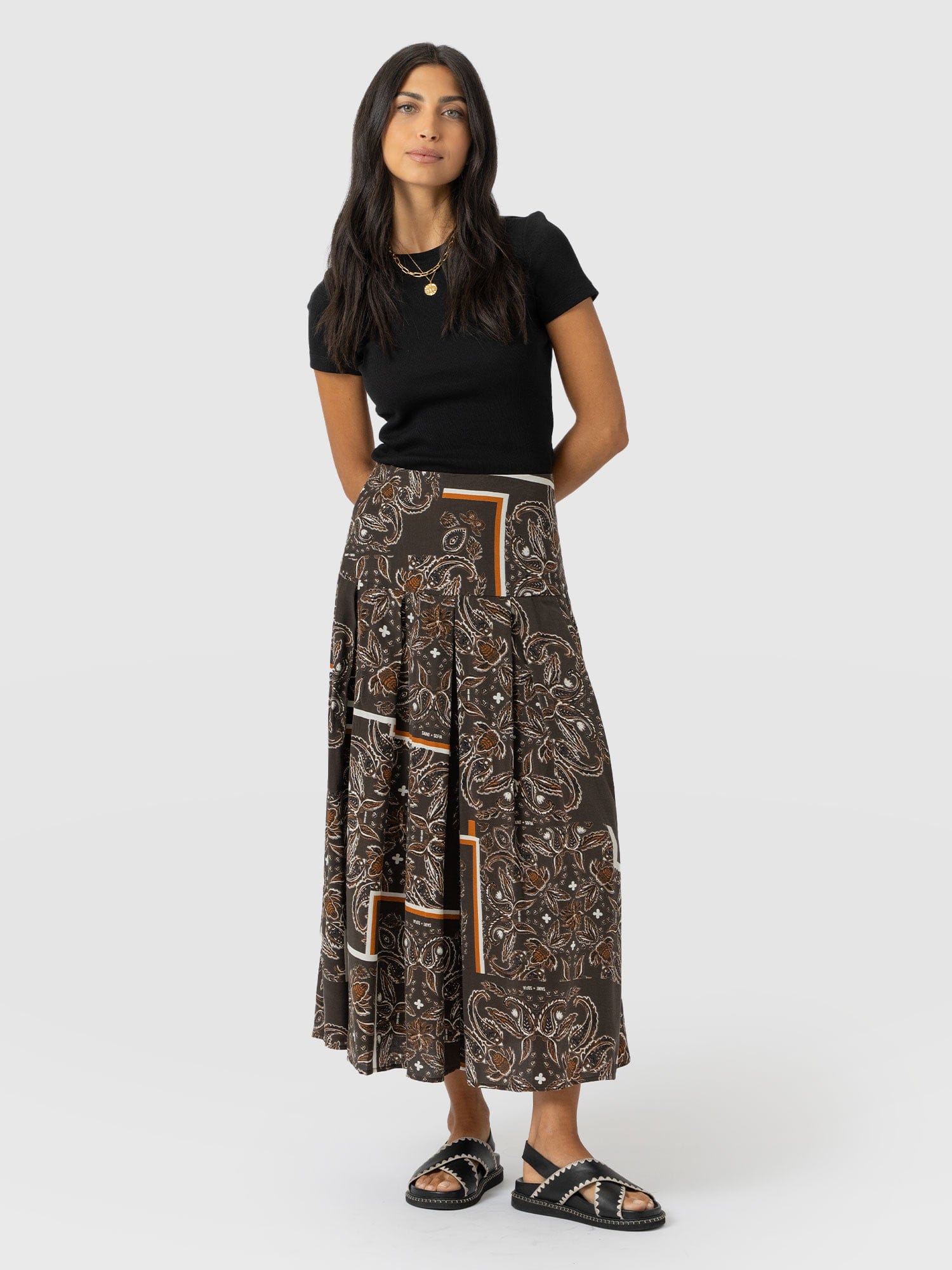 The Everly Pleated Skirt in Brown Paisley is set to be your new staple midi this season. It’s handmade in our family-run studios in Europe using recycled polyester and is shaped to a yoke silhouette with a wide waistband and statement pleated base. But our favourite part? The earthy-toned paisley print that adds a touch of boho to your look. Wear yours with a white vest and finish with a chunky gold necklace.