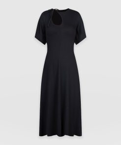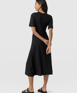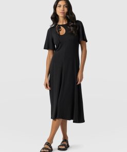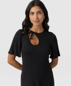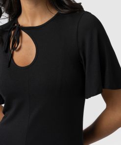 A sleek and elegant black dress, the Freya Tie Dress features a stylish cut-out and neck tie detail that adds a touch of femininity to your look. With flutter sleeves and a midi length, this dress is perfect for any summer occasion. The center front and center back seam create a flattering fit and flare silhouette that accentuates your figure. Made from high-quality materials, this dress is both comfortable and stylish. Style it with a pair of bright Sutton Sandals for a pop of colour, add statement earrings for a complete look.