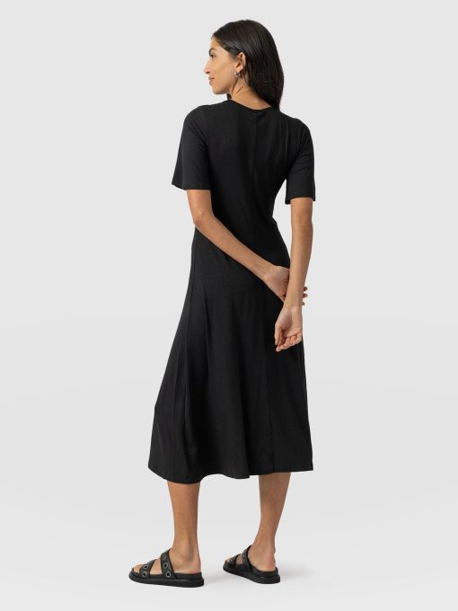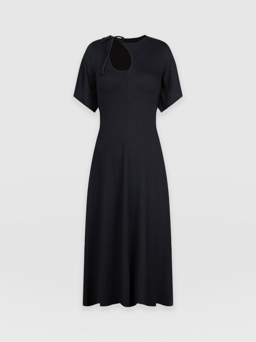 A sleek and elegant black dress, the Freya Tie Dress features a stylish cut-out and neck tie detail that adds a touch of femininity to your look. With flutter sleeves and a midi length, this dress is perfect for any summer occasion. The center front and center back seam create a flattering fit and flare silhouette that accentuates your figure. Made from high-quality materials, this dress is both comfortable and stylish. Style it with a pair of bright Sutton Sandals for a pop of colour, add statement earrings for a complete look.