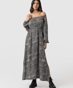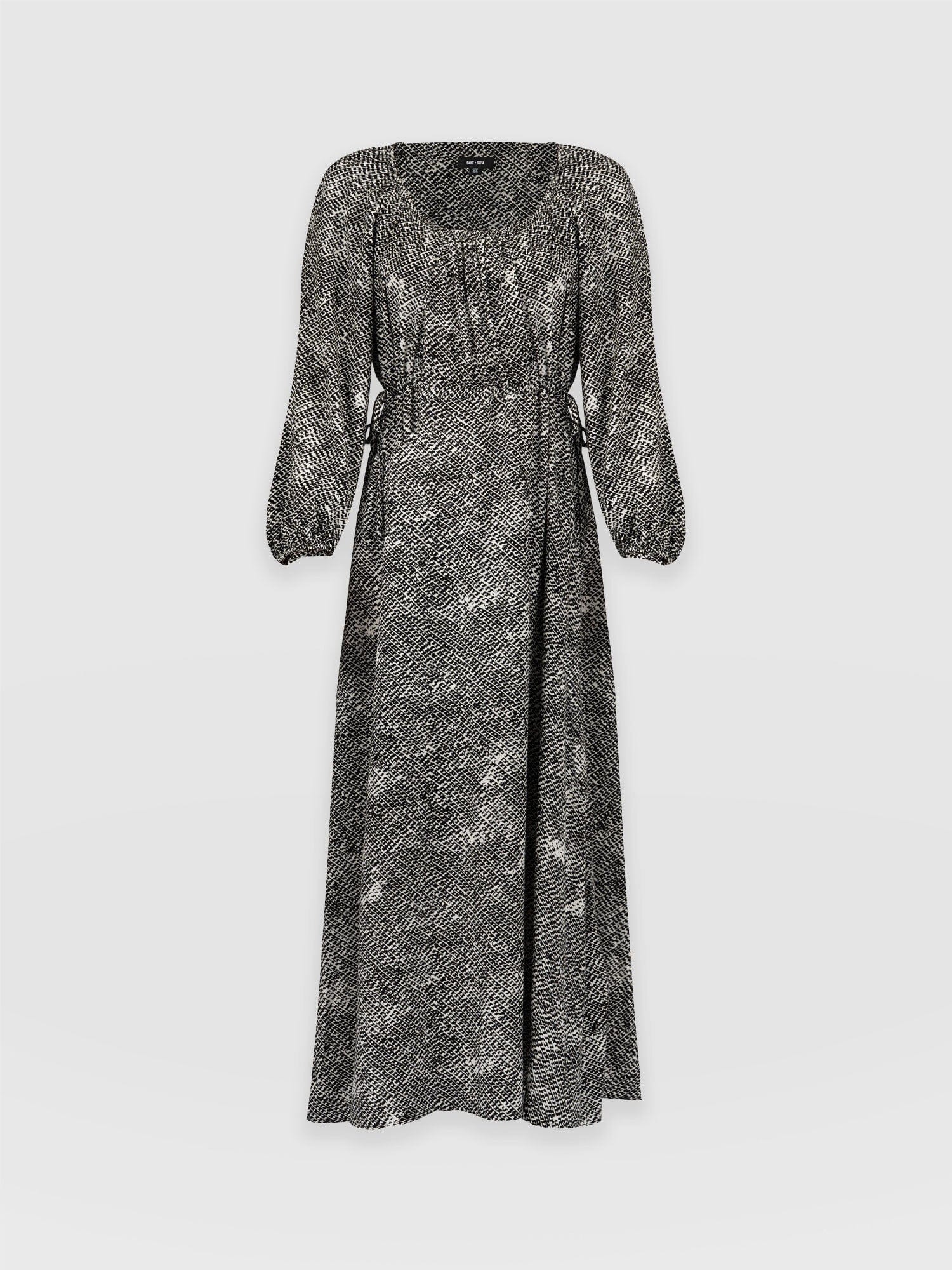 An elegant, scoop neck midaxi dress. The Henrietta Dress is a versatile and chic addition to your wardrobe in our unique monochrome gothica print. This dress offers two different styling options: wear it as a stunning scoop neck, with a sophisticated ruched neckline, or elegantly off the shoulder. The adjustable drawcord waist creates a flattering and fashionable look. For a casual vibe, pair it with our sneakers or boots and a cross-body bag. To elevate your ensemble for a wedding or special occasion, style it with our Odette Block Heel Slingback and Cambridge Blazer.