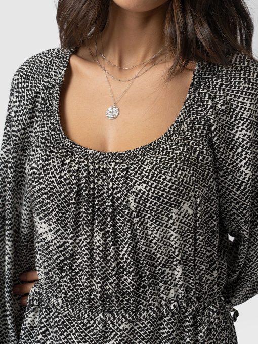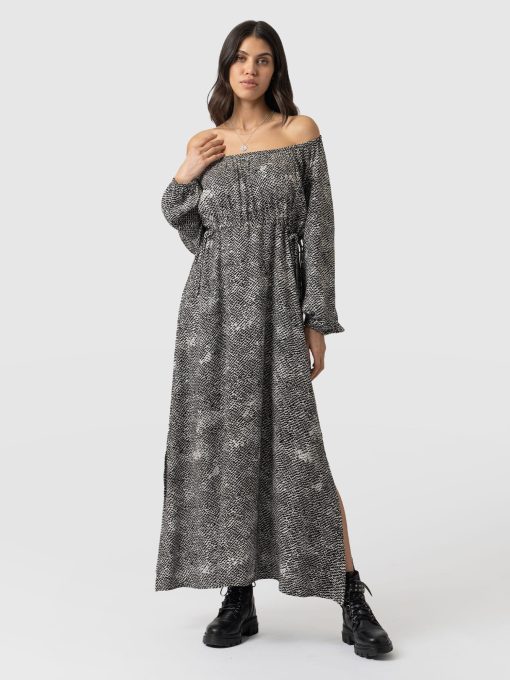 An elegant, scoop neck midaxi dress. The Henrietta Dress is a versatile and chic addition to your wardrobe in our unique monochrome gothica print. This dress offers two different styling options: wear it as a stunning scoop neck, with a sophisticated ruched neckline, or elegantly off the shoulder. The adjustable drawcord waist creates a flattering and fashionable look. For a casual vibe, pair it with our sneakers or boots and a cross-body bag. To elevate your ensemble for a wedding or special occasion, style it with our Odette Block Heel Slingback and Cambridge Blazer.