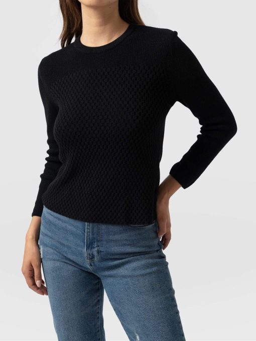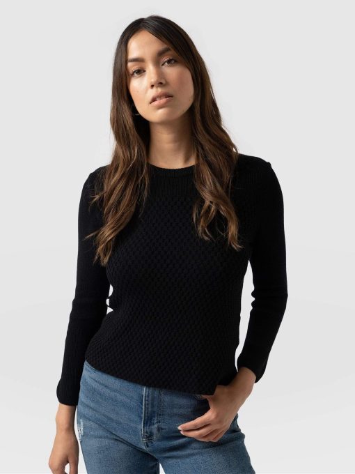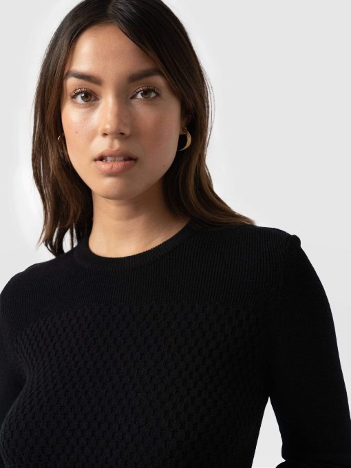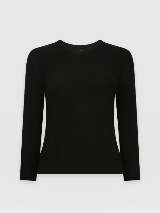 A beautiful rib knit sweater in black, designed for an elegant fit and a stylish look. Made with a soft and sustainable eco friendly viscose fabric that’s super smooth. We designed it with a honeycomb knitted pattern and finished with discrete stitching. Every style is made in our studios in Europe and made by hand. Pair perfectly with jeans or leggings on a weekend for a relaxed look or style with pants and heels for something more formal for work or evenings out.