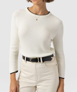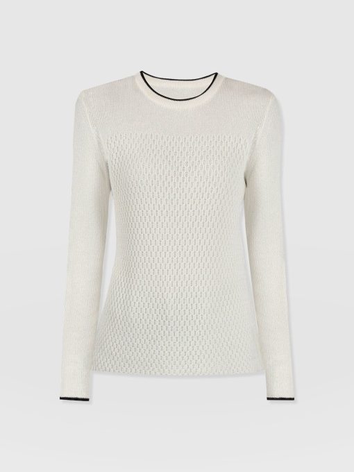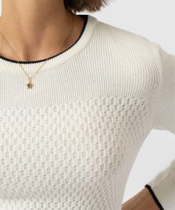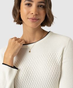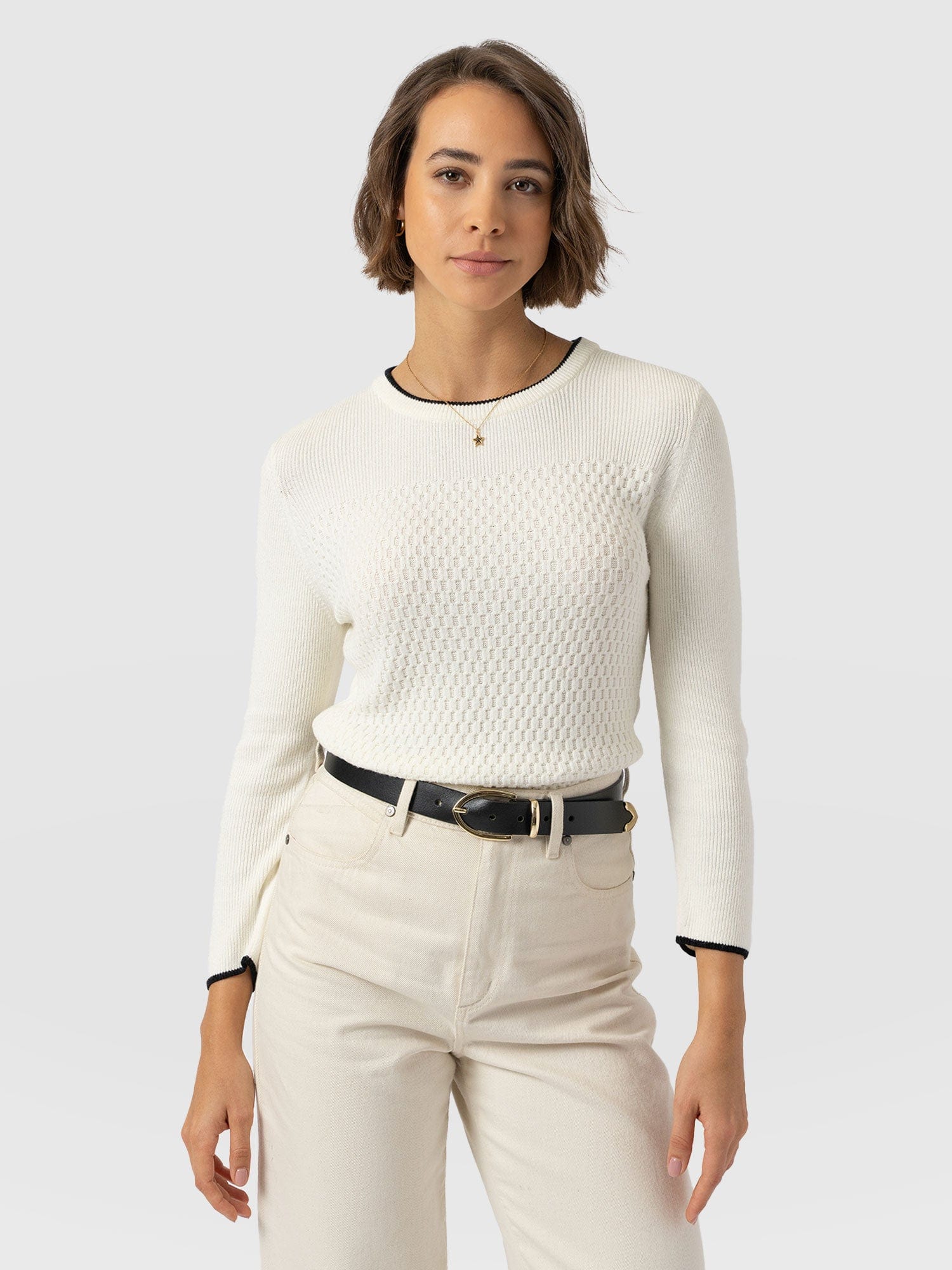 A beautiful rib knit sweater in cream, designed for an elegant fit and a stylish look. Made with a soft and sustainable eco friendly viscose fabric that’s super smooth. We designed it with a honeycomb knitted pattern and finished with discrete stitching. Every style is made in our studios in Europe and made by hand. Pair perfectly with jeans or leggings on a weekend for a relaxed look or style with pants and heels for something more formal for work or evenings out.
