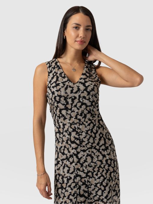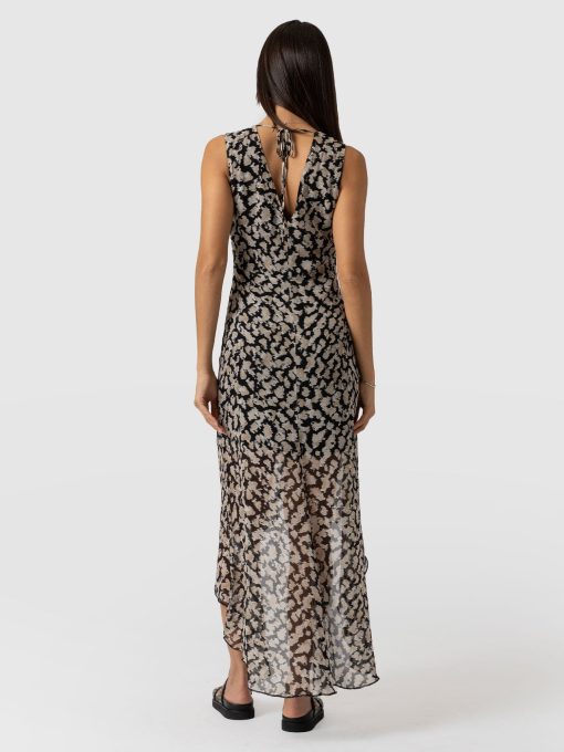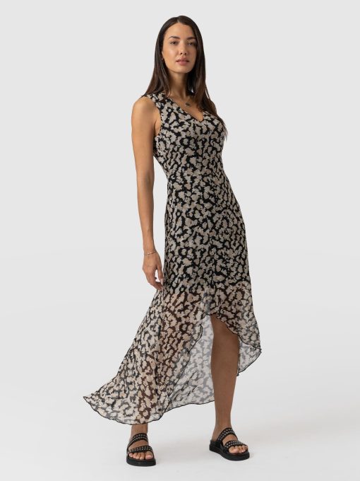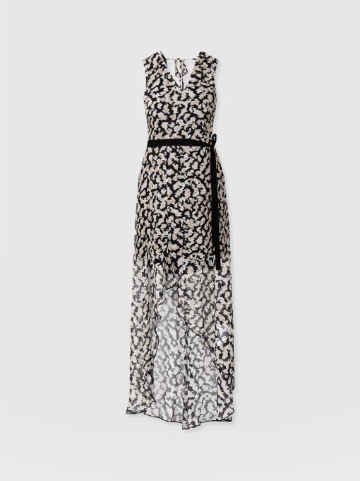 The Lexi High Low Dress in Black Confetti Petal is destined to be a statement piece in your wardrobe. It’s made from silky georgette fabric that offers a semi-sheer finish and features a plunging V-neckline that helps to accentuate your décolletage. The sleeveless design then falls into a skirt with an asymmetric hem. And at the back, a simple tie fastens at the top before leaving your skin on show. It’s a style that’s sure to turn heads.