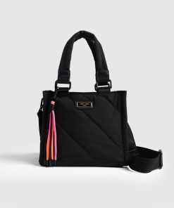 A beautiful, easy to use Tote Bag in black with a nylon quilted square shape and a quilted handle. Perfect for everyday wear, the bag is embellished with a branded Saint and Sofia plaque and a 100% leather trim for a subtle elegance. It also features a removable keyring with orange, pink and black cords. Add the detachable crossbody strap for ease, or remove it for a chic hand-held bag. It pairs superbly with both daily wear and evening outings.