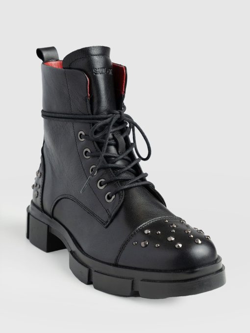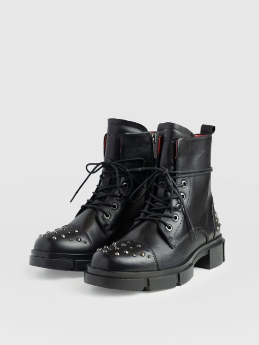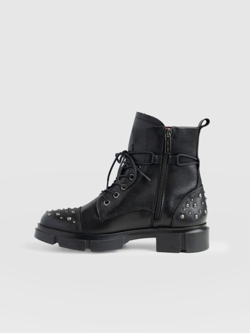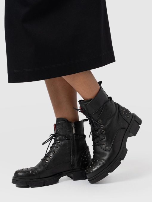 A studded tie-up boot in black handmade in Portugal using the softest leather and a chunky rubber sole. We only make a few of the Noho boots at a time to ensure every detail is finished to the highest quality. They have a wider fit to ensure you stay comfortable even after hours of walking, and they’re structured with a timeless design that you’re sure to be wearing years from now. Style them with pants, skirts, or dresses to create an on-trend look.