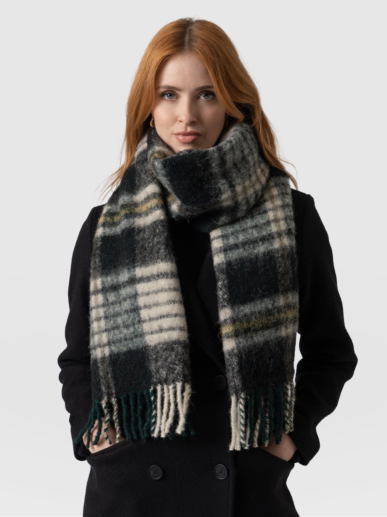 The Nora Check Scarf in Black, Cream, and Green check is a fluffy checked scarf that is the perfect accessory to elevate your winter look. Its bold design adds a pop of colour and texture to your outfit, making it an ideal complement to our new outerwear collection. Each one is handmade using the softest wool on the shores of Lake Como in Italy.