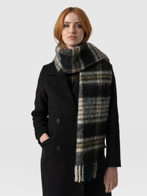 The Nora Check Scarf in Black, Cream, and Green check is a fluffy checked scarf that is the perfect accessory to elevate your winter look. Its bold design adds a pop of colour and texture to your outfit, making it an ideal complement to our new outerwear collection. Each one is handmade using the softest wool on the shores of Lake Como in Italy.