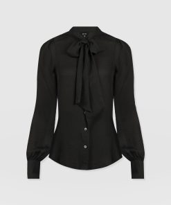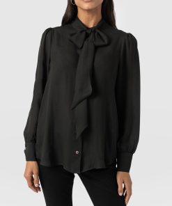 Meet the Paxton Blouse: an elegant button-up handmade from a semi-sheer georgette fabric and fitted with a detachable pussybow at the neckline for versatile styling. The delicate layer is trimmed with subtle raglan sleeves and faux mother-of-pearl buttons at the cuffs for a beautifully chic finish. Style yours with a pair of the Maeva Skinny Pants or our leather shorts and tights.