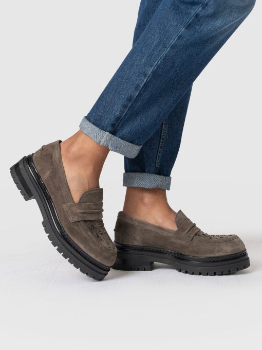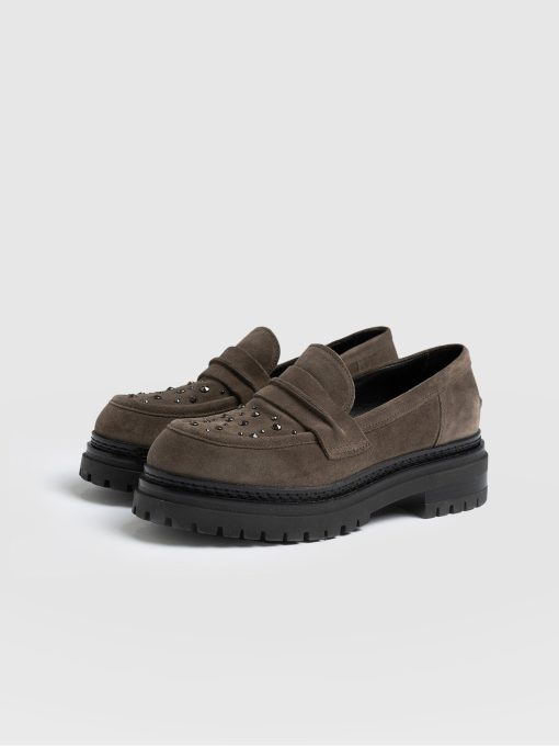 Handmade in Italy using the finest suede, the Raine Loafers in taupe are a classic pair to add to any wardrobe. Their chunky sole makes them perfect for creating looks with attitude, while the soft feel provides instantly comfortable wear. Plus, the hexagonal stud details that glitter the front help to add a touch of sparkle to everyday styles. Slip into them with jeans, skirts, or dresses – the choice is yours.