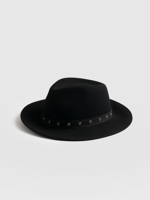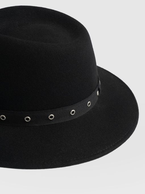 A classic fedora hat in black, with a twist. Eyelet tape along the base makes this a styling addition for any look for years to come. Each hat is hand made in Italy with the finest materials. Style with anything.
