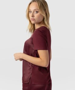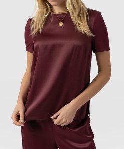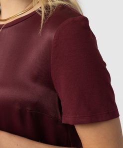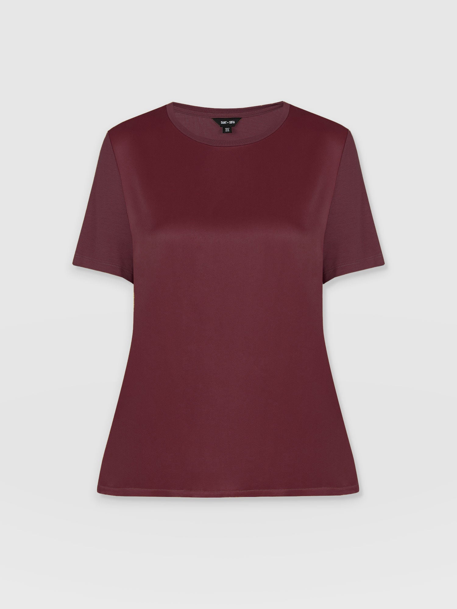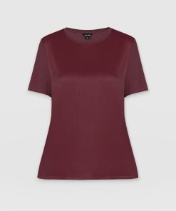 The Rayner Contrast Tee in maroon uses a beautiful blend of textures to elevate your classic crew neck tee. Handmade by artisans in Europe, this timeless design features a glossy satin front panel with a soft and smooth jersey decorating the sleeves and back panel. It’s cut to a relaxed fit for easy wear and looks chic when styled with the Bowie Jeans and your favourite sneakers.