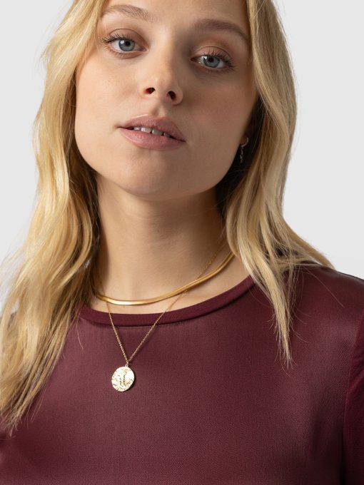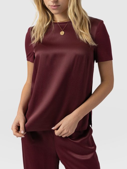 The Rayner Contrast Tee in maroon uses a beautiful blend of textures to elevate your classic crew neck tee. Handmade by artisans in Europe, this timeless design features a glossy satin front panel with a soft and smooth jersey decorating the sleeves and back panel. It’s cut to a relaxed fit for easy wear and looks chic when styled with the Bowie Jeans and your favourite sneakers.