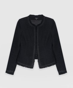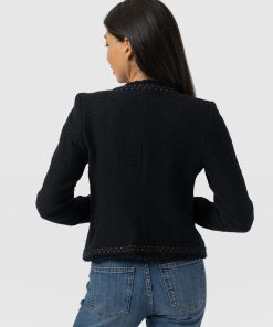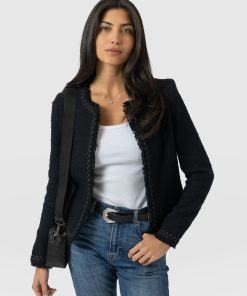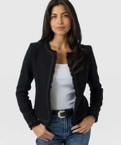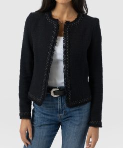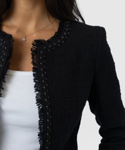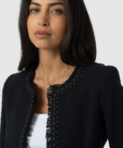 A beautiful, tailored jacket for a smart, sophisticated look in black bouclé fabric. Named after Bessie Rayner Parkes who was a poet, journalist and prominent campaigner for women’s rights in the Victorian times. Each jacket is designed in our London studios and handmade in Europe with a panel detailed bouclé fabric that’s soft and sustainable. We finish each style by hand with a stylish, raw edge fringe and a black bouclé fabrication. Comfortable and semi-fitted, wear it for work with matching our Cambridge Short or pair with jeans on a weekend.