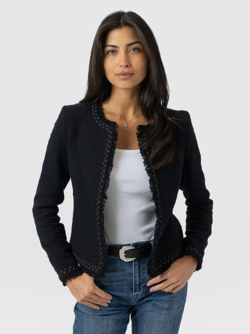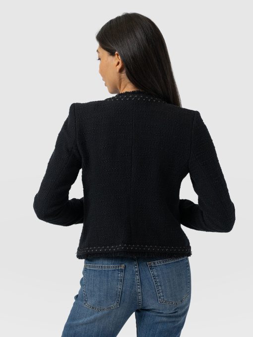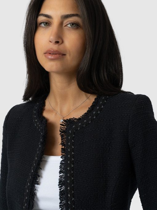 A beautiful, tailored jacket for a smart, sophisticated look in black bouclé fabric. Named after Bessie Rayner Parkes who was a poet, journalist and prominent campaigner for women’s rights in the Victorian times. Each jacket is designed in our London studios and handmade in Europe with a panel detailed bouclé fabric that’s soft and sustainable. We finish each style by hand with a stylish, raw edge fringe and a black bouclé fabrication. Comfortable and semi-fitted, wear it for work with matching our Cambridge Short or pair with jeans on a weekend.