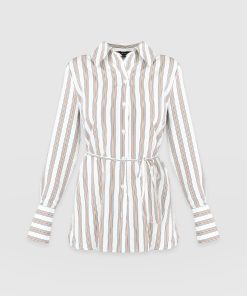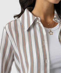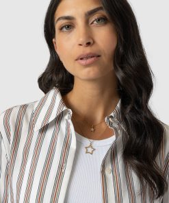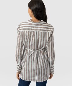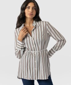 A beautiful two-in-one design, the Reagan Tie Shirt is a lightweight style cloaked in earthy-toned stripes. Made from a planet-friendly material, this button-up piece features a classic collared neckline and cuffed hems for a tailored look. But, at the waistline, a detachable belt allows you to cinch in the silhouette to create a blouse-inspired shape for more elegant outfits. You’ll also spot a small embroidered detail at the placket in the form of a rock-and-roll lightning bolt.