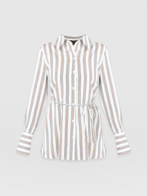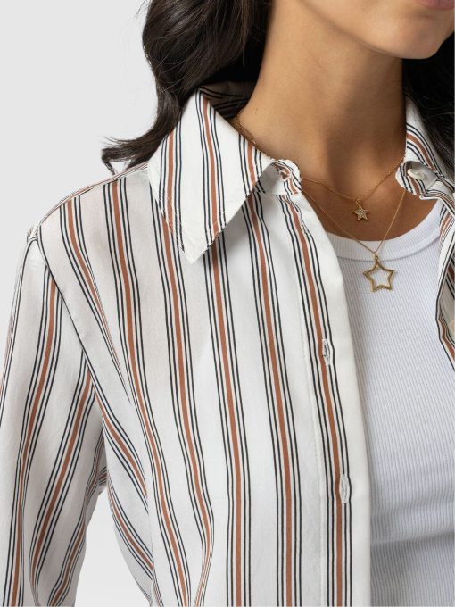 A beautiful two-in-one design, the Reagan Tie Shirt is a lightweight style cloaked in earthy-toned stripes. Made from a planet-friendly material, this button-up piece features a classic collared neckline and cuffed hems for a tailored look. But, at the waistline, a detachable belt allows you to cinch in the silhouette to create a blouse-inspired shape for more elegant outfits. You’ll also spot a small embroidered detail at the placket in the form of a rock-and-roll lightning bolt.