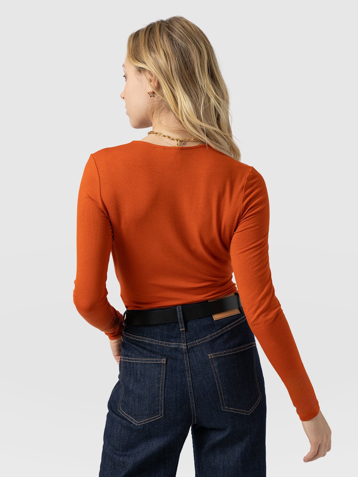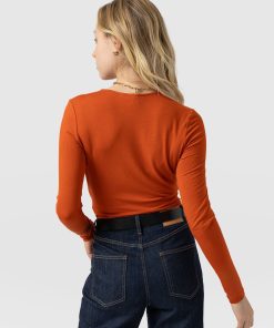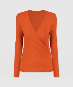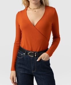 A seasonal take on your favourite wrap tee. This amber Rosa Tee is made from a stretchy jersey material that skims your body with a slim fit for a sculpted silhouette. It’s topped by a plunging V-neckline thanks to its waist-defining wrap-around finish and features long sleeves to keep you warm amid cooling temperatures. Wear yours with your favourite jeans and a pair of Spitalfields Trainers for an easy daywear look.