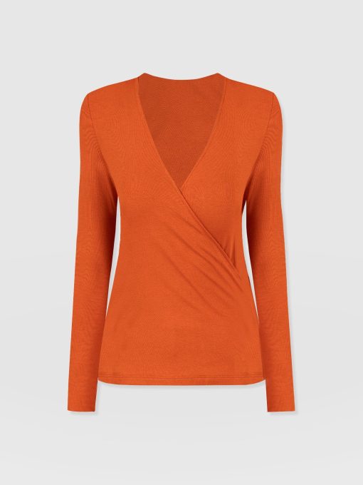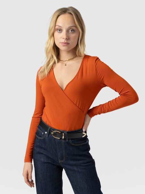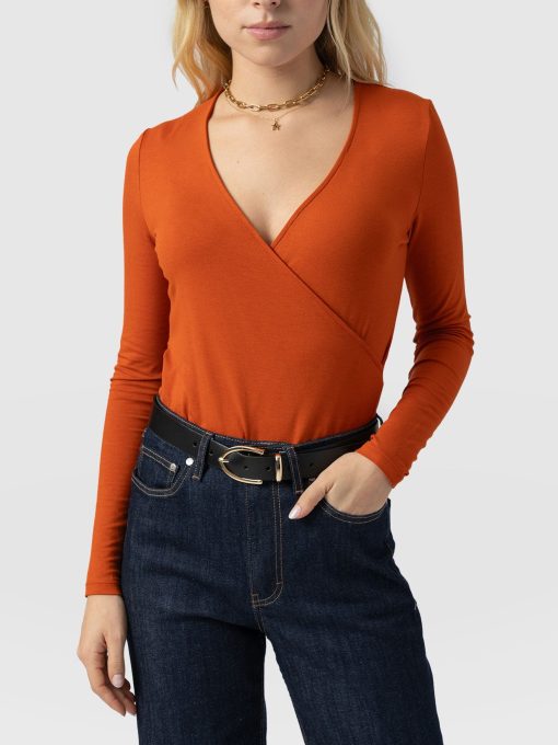 A seasonal take on your favourite wrap tee. This amber Rosa Tee is made from a stretchy jersey material that skims your body with a slim fit for a sculpted silhouette. It’s topped by a plunging V-neckline thanks to its waist-defining wrap-around finish and features long sleeves to keep you warm amid cooling temperatures. Wear yours with your favourite jeans and a pair of Spitalfields Trainers for an easy daywear look.