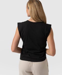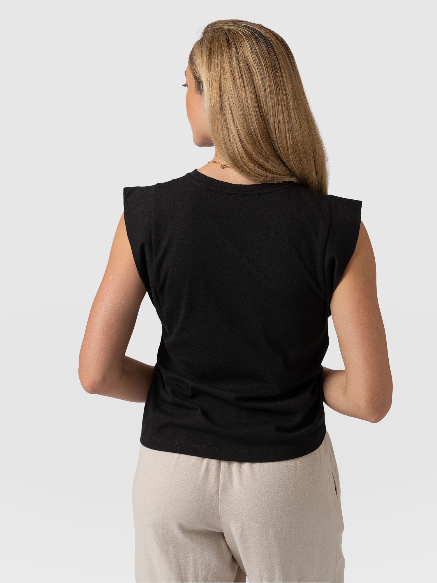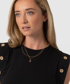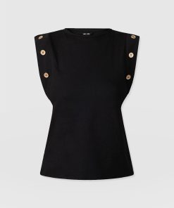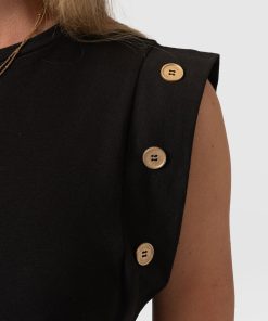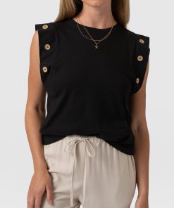 A staple T-shirt to add to your everyday collection, The Rowan Tee in black is a casual design made from soft and gentle cotton. It’s shaped to a relaxed fit with a sleeveless frame to add some edge to the classic crew neck silhouette. At the sleeves, gold-toned buttons trace up the sides for a sophisticated touch. Pair yours with the Finsbury Pant or Wide Leg Jeans and your favourite sneakers for a comfortable and always-on-trend look.