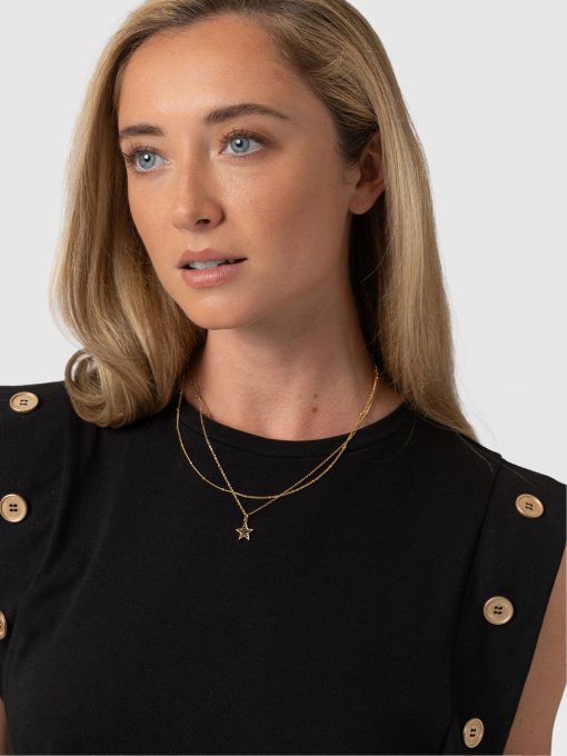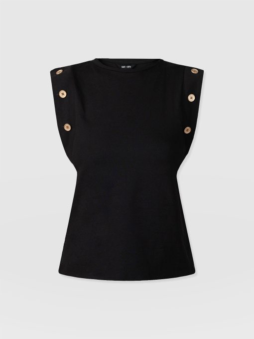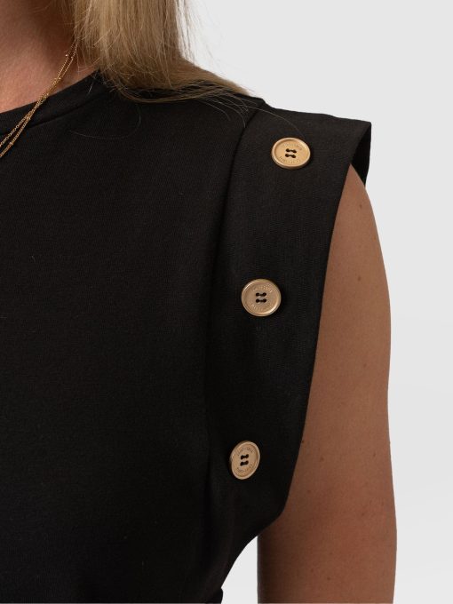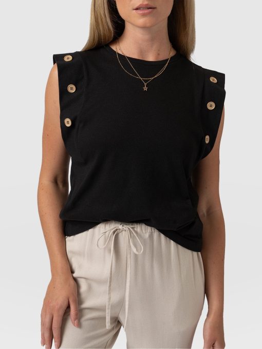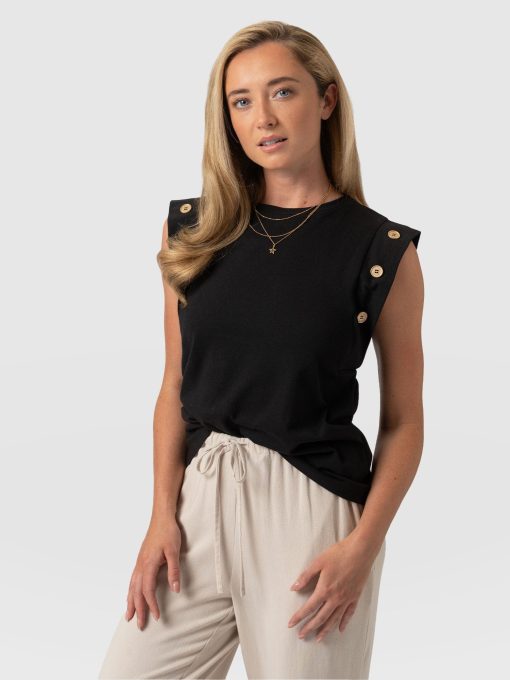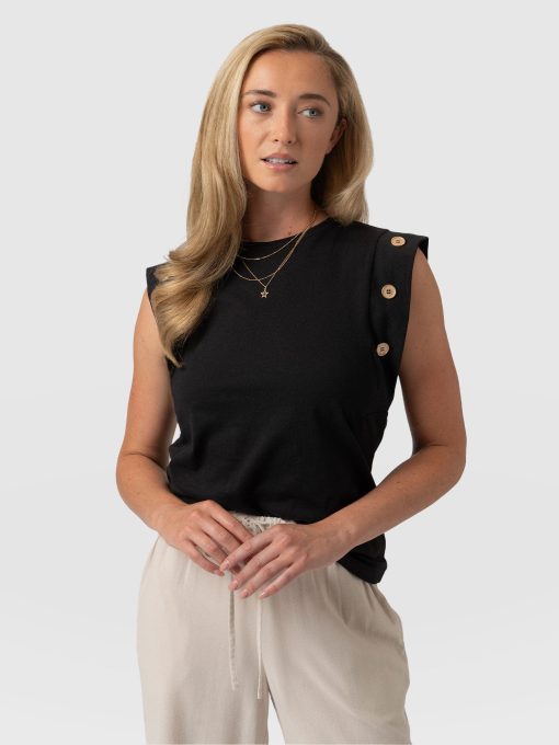 A staple T-shirt to add to your everyday collection, The Rowan Tee in black is a casual design made from soft and gentle cotton. It’s shaped to a relaxed fit with a sleeveless frame to add some edge to the classic crew neck silhouette. At the sleeves, gold-toned buttons trace up the sides for a sophisticated touch. Pair yours with the Finsbury Pant or Wide Leg Jeans and your favourite sneakers for a comfortable and always-on-trend look.