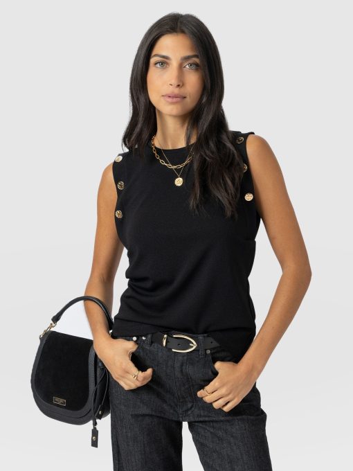 A staple T-shirt to add to your everyday collection, The Rowan Tee in Black is a casual design made from soft and gentle cotton. It’s shaped to a relaxed fit with a sleeveless frame to add some edge to the classic crew neck silhouette. At the sleeves, gold-toned molten buttons trace up the sides for a sophisticated touch. Pair yours with the Finsbury Pant or Wide Leg Jeans and your favourite trainers for a comfortable and always-on-trend look.
