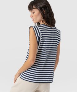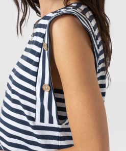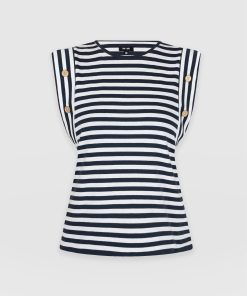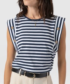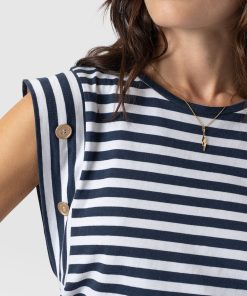 This nautical-inspired striped t-shirt in navy stripe features a relaxed fit and standard length, with added sophistication from the brushed gold button detail on the sleeves. Pair it with the Finsbury Pant or Adjustable Wide Leg Jeans and your favourite sneakers for a comfortable and trendy look.