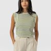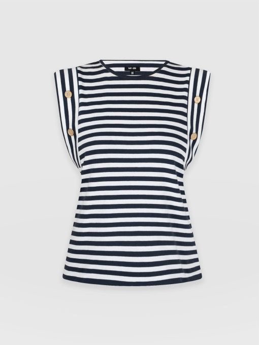 This nautical-inspired striped t-shirt in navy stripe features a relaxed fit and standard length, with added sophistication from the brushed gold button detail on the sleeves. Pair it with the Finsbury Pant or Adjustable Wide Leg Jeans and your favourite sneakers for a comfortable and trendy look.