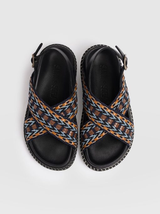 Meet the Bonnie Cross Over Sandals in Blue and Brown. This laid-back style is designed with coastal towns and sun-soaked cities in mind. Handmade by our skilled artisans using Portuguese leather, they’re shaped to a classic round-toe silhouette and feature cross-over raffia straps with a chunky sling-back fastening for all-day comfort. Wear yours with skirts, dresses, or trousers.