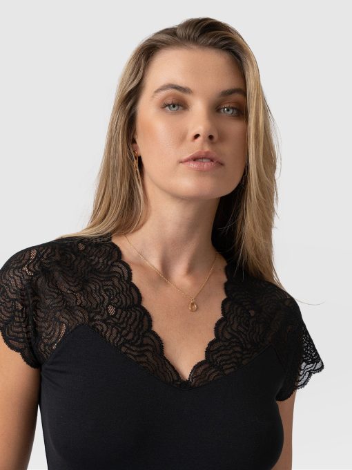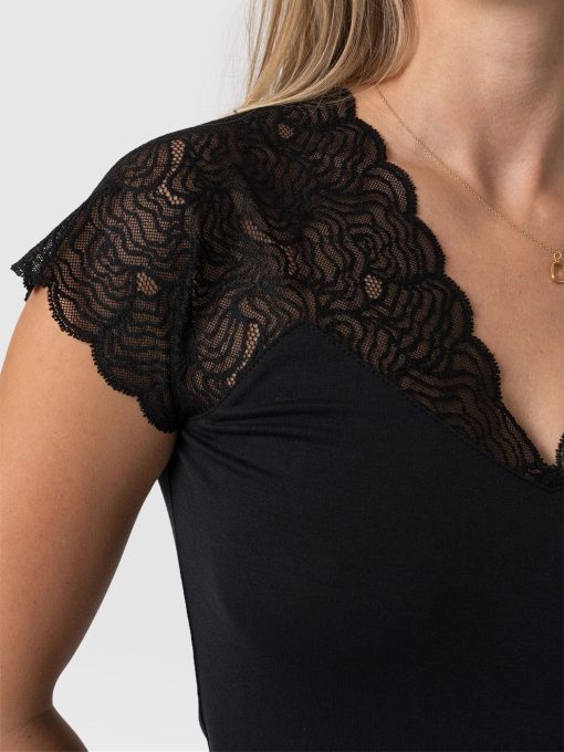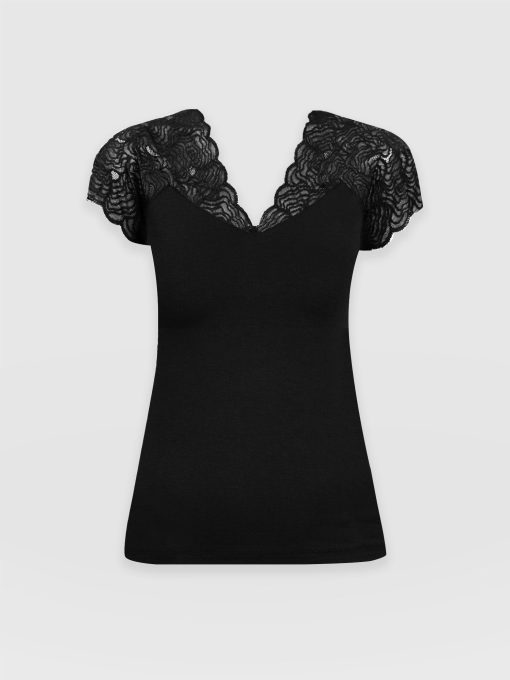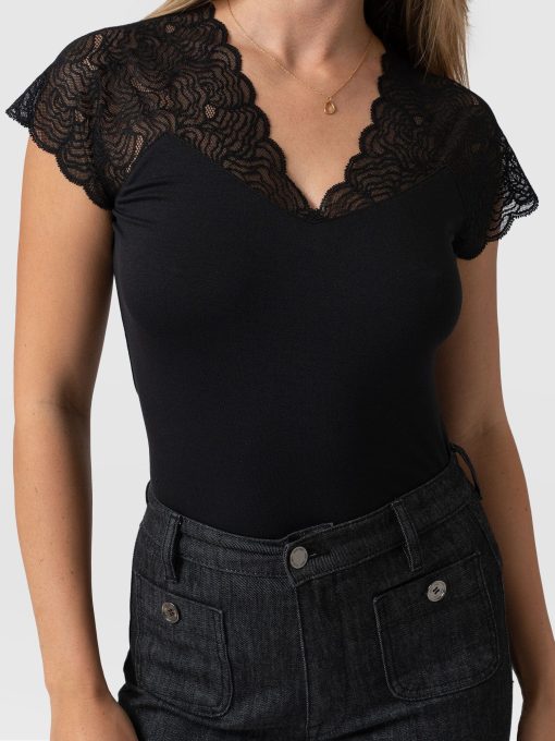 A chic jersey top with delicate lace trim in Black that’s perfect for work or weekends. This elegant top adds a touch of sophistication to any look, featuring a V-neck design that beautifully accentuates the neckline, while the fitted viscose body flatters your shape. Perfect for pairing with both casual and dressy looks, this top is a versatile style suitable for any occasion. Each top is handmade in Europe using a soft and sustainable eco viscose fabric. For a polished and chic look, style it with our Cambridge Tailored Pant and a pair of strappy heels.