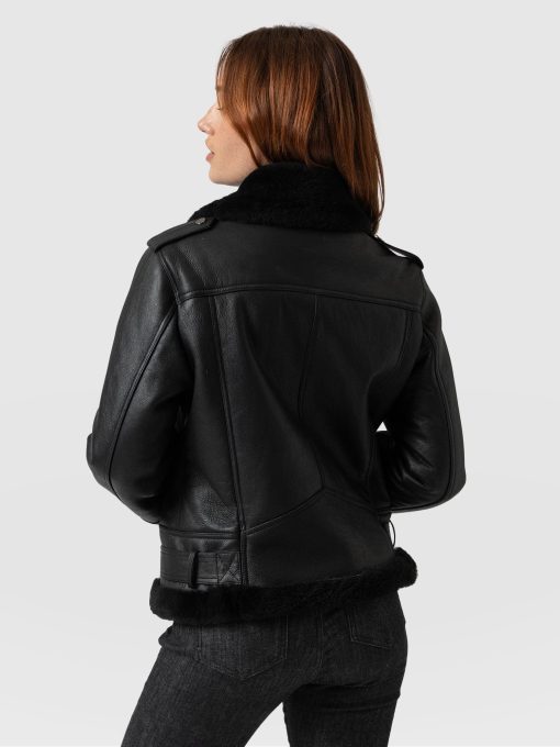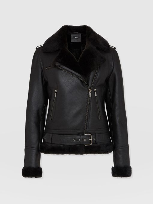 A classic aviator shearling jacket in black made with the softest, warming sheepskin leather. Relaxed, easy shape with belt detail on the hem for adjustment and epaulette detail on the shoulders. Gunmetal poppers and zippers. Each one is made by hand in our studios in Europe to guarantee the perfect fit and feel. We think you’ll be wearing this in years to come. Pair it with anything for a comfortable, chic look.