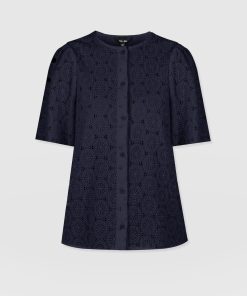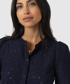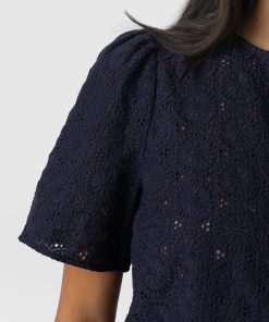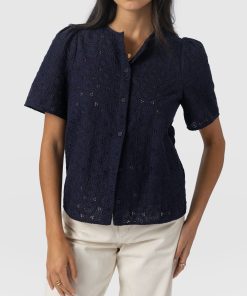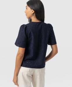 A short-sleeve blouse that’s perfect for any occasion. The Tabitha Blouse in Navy is masterfully handmade using organic cotton and shaped to a classic button-up shirt style. The neckline forgoes the traditional collar for a more casual crew neck while the lightly puffed sleeves add a hint of elegance. And to tie everything together with a beautifully chic finish, it’s decorated in broderie anglaise for a semi-sheer look.