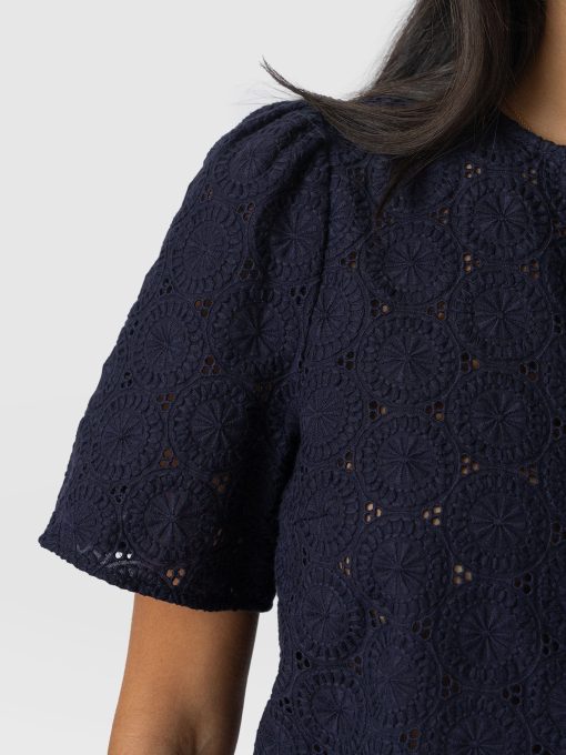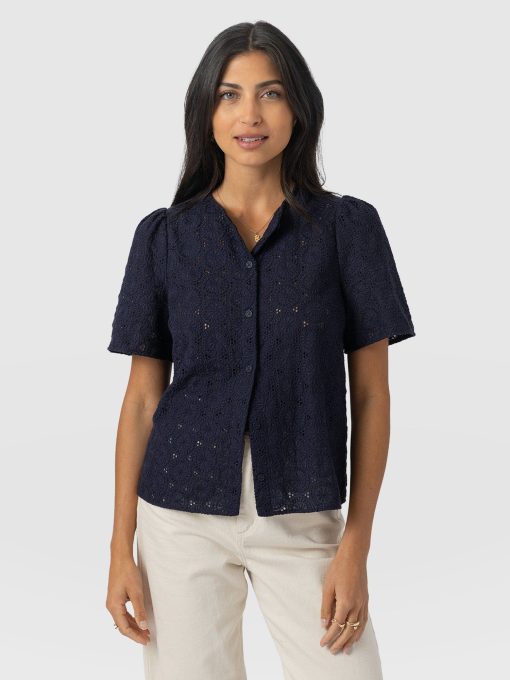 A short-sleeve blouse that’s perfect for any occasion. The Tabitha Blouse in Navy is masterfully handmade using organic cotton and shaped to a classic button-up shirt style. The neckline forgoes the traditional collar for a more casual crew neck while the lightly puffed sleeves add a hint of elegance. And to tie everything together with a beautifully chic finish, it’s decorated in broderie anglaise for a semi-sheer look.