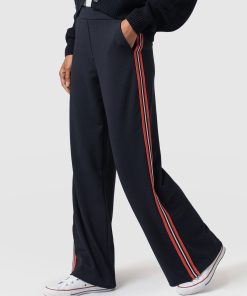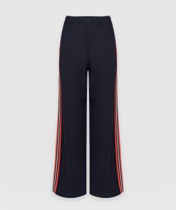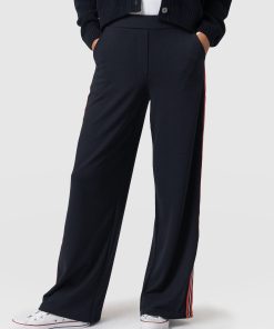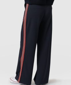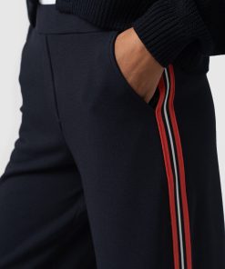 A classic straight leg pant style in navy with a red side stripe detail. They’re high waisted with an elasticated fit for comfort. They’re smarter than jeans but comfortable like leggings. Made with a crease free ponte fabric. Perfect for work or weekends, pair with Sneakers for a casual look or with heels or boots to make a statement.