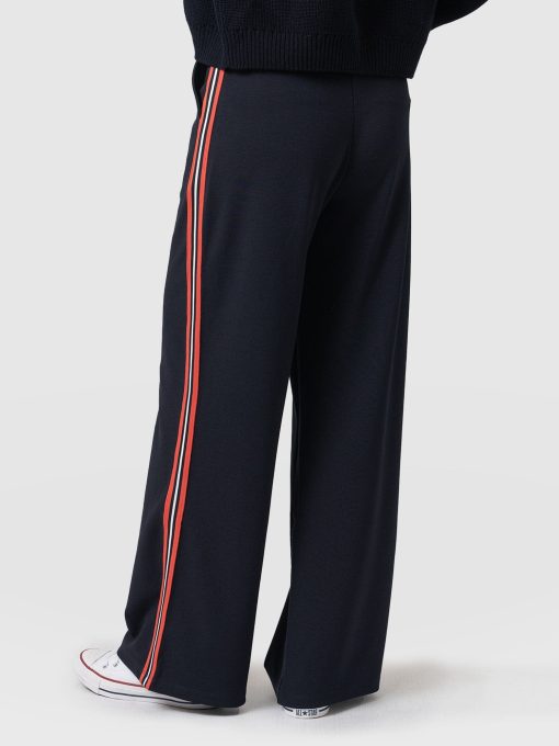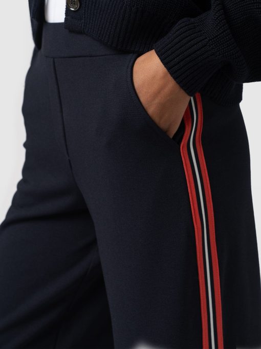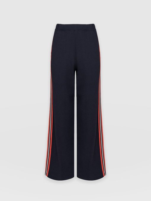 A classic straight leg pant style in navy with a red side stripe detail. They’re high waisted with an elasticated fit for comfort. They’re smarter than jeans but comfortable like leggings. Made with a crease free ponte fabric. Perfect for work or weekends, pair with Sneakers for a casual look or with heels or boots to make a statement.