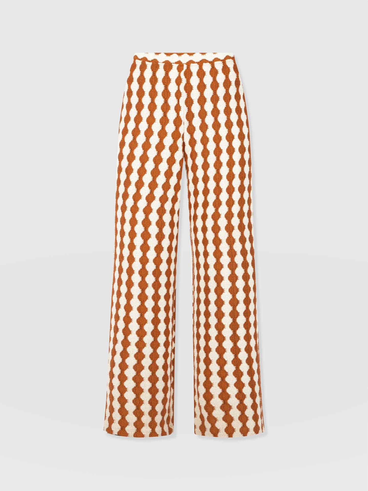 Our Victory Rib Wide High-Waisted Leg Pant in brown and cream is a wide-leg trouser with a crochet-effect finish. It features a comfortable elasticated waist in a soft and smooth material that’s infused with a hint of stretch. Style it with our matching Edna Scoop Neck Tee, or wear it alone with a vest and a pair of sneakers – or sandals in the summer.