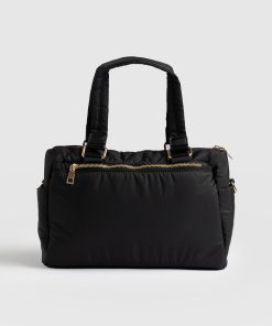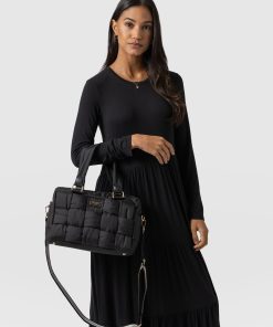The Woven Duffle Bag in black is a chic, classic bag style that is both easy to use and flattering to wear. It’s designed to be multi-purpose for work or weekends. Finished with branded gold trims and a branded plaque on the centre front. It has an easily detachable cross-body strap to wear out or carry with the strap. We’ve also added a striped design on the strap for contrast. This colourway pairs elegantly with a pair of blue denim jeans or a head-to-toe black outfit. Limited number available.