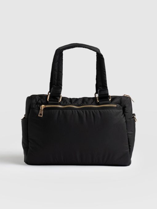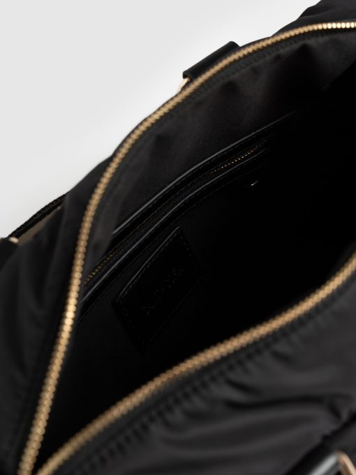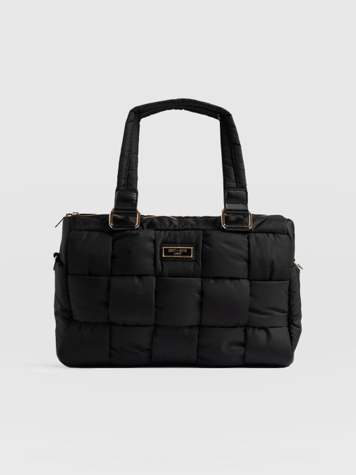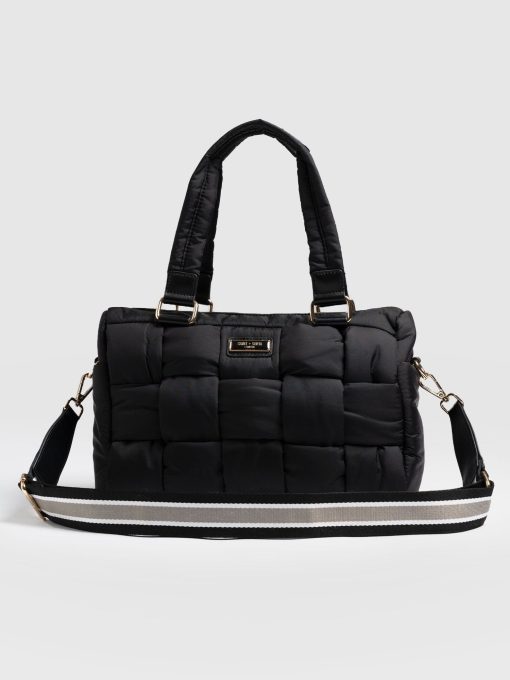 The Woven Duffle Bag in black is a chic, classic bag style that is both easy to use and flattering to wear. It’s designed to be multi-purpose for work or weekends. Finished with branded gold trims and a branded plaque on the centre front. It has an easily detachable cross-body strap to wear out or carry with the strap. We’ve also added a striped design on the strap for contrast. This colourway pairs elegantly with a pair of blue denim jeans or a head-to-toe black outfit. Limited number available.