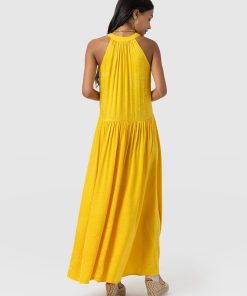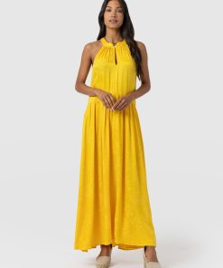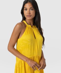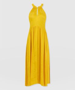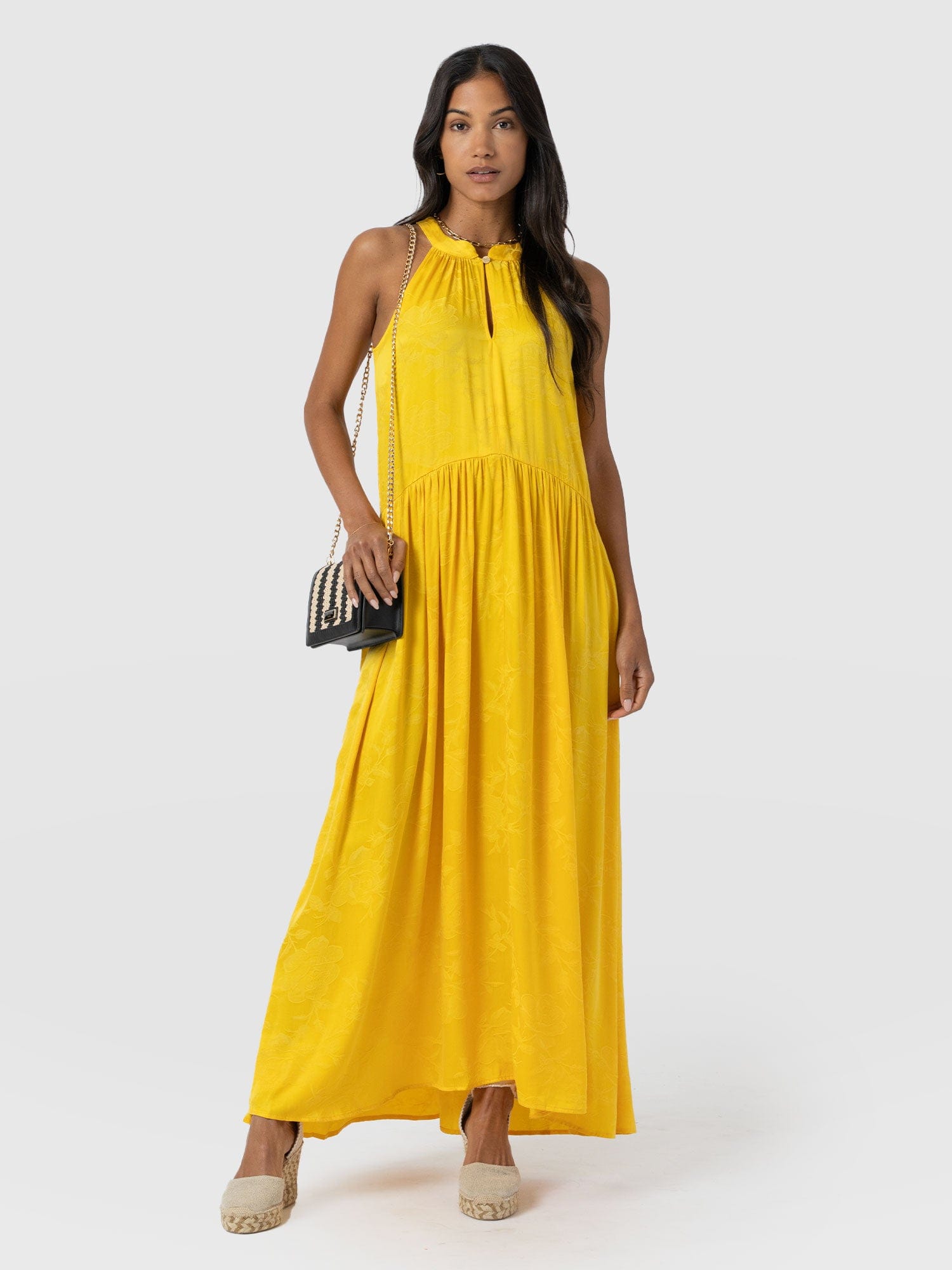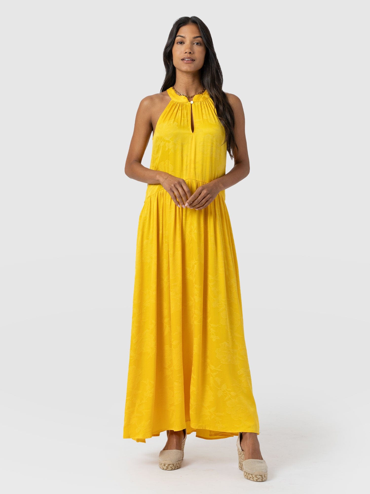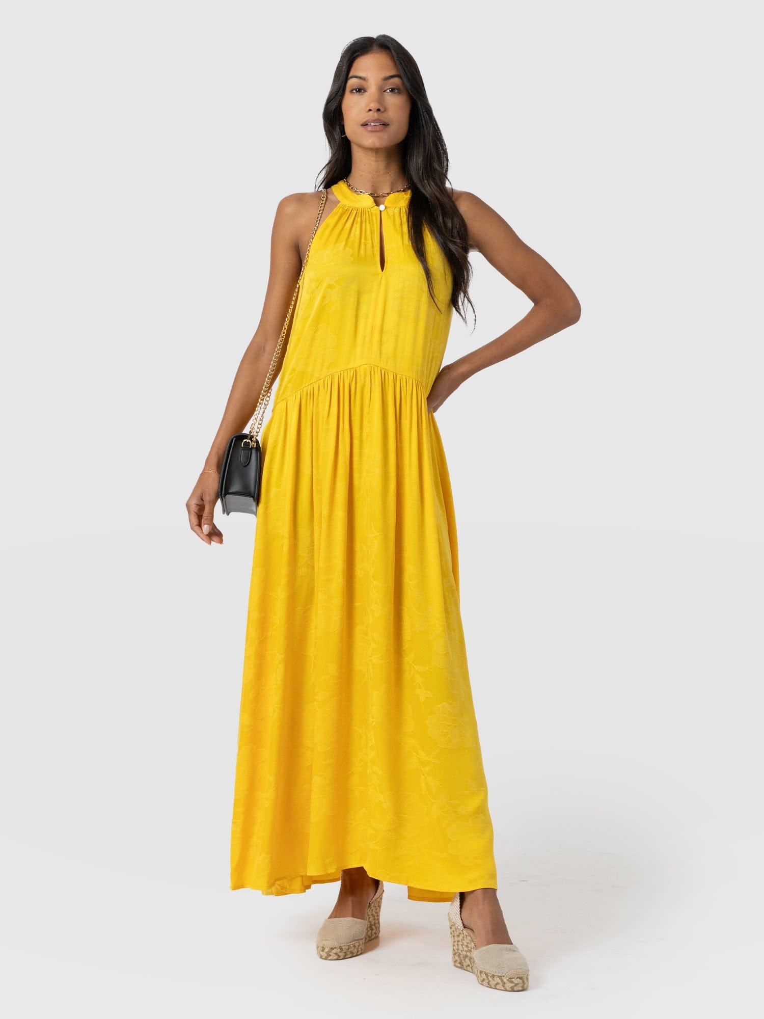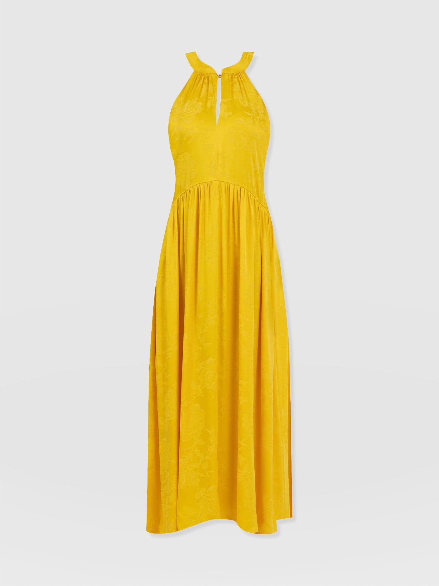 It doesn’t get more elegant than our Zoey Halter Neck Dress in yellow. This beautiful design is handmade by our skilled artisans in Europe using sumptuously soft viscose and is delicately detailed with a floral jacquard. The halterneck bodice features a slim cut-out at the chest before falling into a maxi-length skirt that hangs in gentle pleats. Pair yours with the Bridget Sling Back Heels to complete the look.